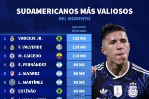 体育资讯4月12日讯 德国转会市场列出了南美球员身价排名,维尼修斯1.5亿欧居首,巴尔韦德1.2亿欧次席。