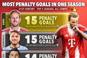 体育资讯04月13日讯 Score90列出了本世纪单赛季点球进球榜,凯恩以15球与因莫比莱并列第一,C罗、梅西以14球并列第三。