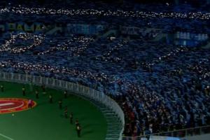 体育资讯04月22日讯 中超第7轮,辽宁铁人主场迎战大连英博。大连英博球迷在客队看台用手机闪光灯拼出“大连”字母。
