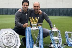 18-19赛季曼城历史性夺得英格兰国内三冠王,瓜帅与助教阿尔特塔合影奖杯