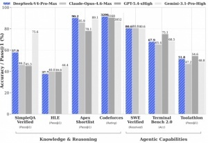 丰富的世界知识:DeepSeek-V4-Pro 在世界知识测评中,大幅领先其他开源模型,仅稍逊于顶尖闭源模型 Gemini-Pro-3.1。