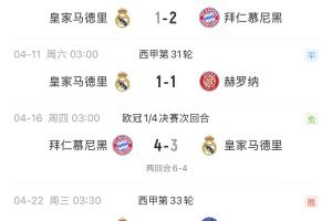 皇马四月份各赛事1胜2平3负,欧冠遭拜仁双杀淘汰,联赛先赛暂落后巴萨8分。