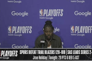 体育资讯4月25日讯 NBA季后赛,开拓者108-120不敌马刺,大比分1-2落后。赛后朱·霍勒迪接受了媒体采访,以下为采访全文。
