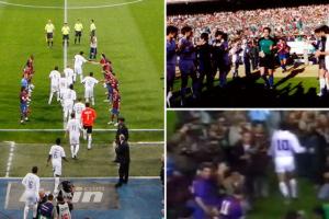 1987/88赛季,“秃鹫五鹰”时代的皇马提前四轮夺冠,国家德比做客诺坎普。当时巴萨向皇马列队致敬,皇马也立即对对手的这一举动表示感谢。