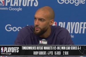 体育资讯4月26日讯 在今天结束的一场季后赛中,森林狼以112-96战胜掘金。赛后,森林狼球星鲁迪·戈贝尔出席了新闻发布会。以下是完整版采访内容。