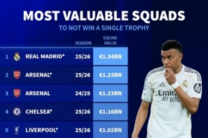 体育资讯4月27日讯 德国转会市场列出了赛季无冠球队身价排名,如果皇马、阿森纳本赛季无缘冠军,将排名前两位。