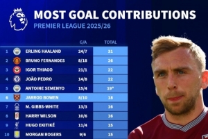 本赛季英超参与进球榜:哈兰德31球居首,B费26球次席