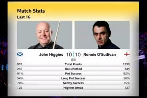 体育资讯04月27日讯 斯诺克世锦赛1/8决赛第三阶段,上半场希金斯3-1奥沙利文,大比分扳成10-10平。