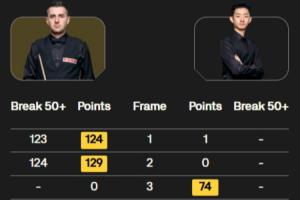 两人鏖战24局,其中吴宜泽单局最高90分,共打出五杆50+;塞尔比则打出两杆破百和七杆50+。