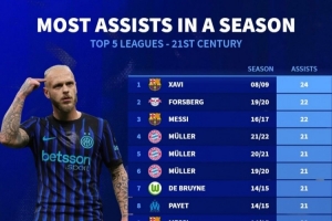 本世纪单赛季助攻排名:哈维24助居首,本赛季迪马尔科18助
