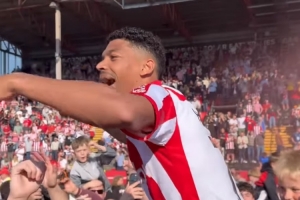 林肯城球员与球迷庆祝升级,并一起高唱:“去客场踢热刺啦!”
