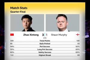 比赛开场,赵心童打出单杆122分先声夺人,第二局肖恩·墨菲打出单杆60分却被赵心童完成逆转,随后赵心童与墨菲各胜一局结束上半场,其中墨菲在第四局中打出单杆69分。