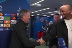 巴黎主帅恩里克、拜仁主帅孔帕尼赛后在媒体采访区见面交流,两人都露出笑容。