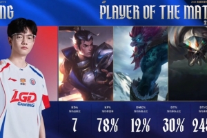 体育资讯4月30日讯 LGD今日让一追二战胜TT后来到涅槃组头名,LGD打野Heng本场比赛发挥出色,三局比赛合计砍下4-4-23的数据,当选本场比赛大场POM!