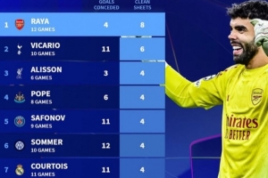 本赛季欧冠零封榜:拉亚8场居首,维卡里奥6场、阿利松等6人均4场
