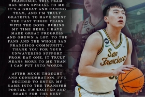 王俊杰写道:“首先,我想感谢旧金山大学的教练和队友们。这支球队对我来说意义非凡,这是一个充满关怀的伟大团队。我非常感激过去三年能够与多恩队共度时光。在这里的日子里,我取得了很大的进步,也成长了许多。对于球迷和整个旧金山社区,从第一天起你们就给予了我坚定不移的支持,这对我来说意义重大,难以言表。